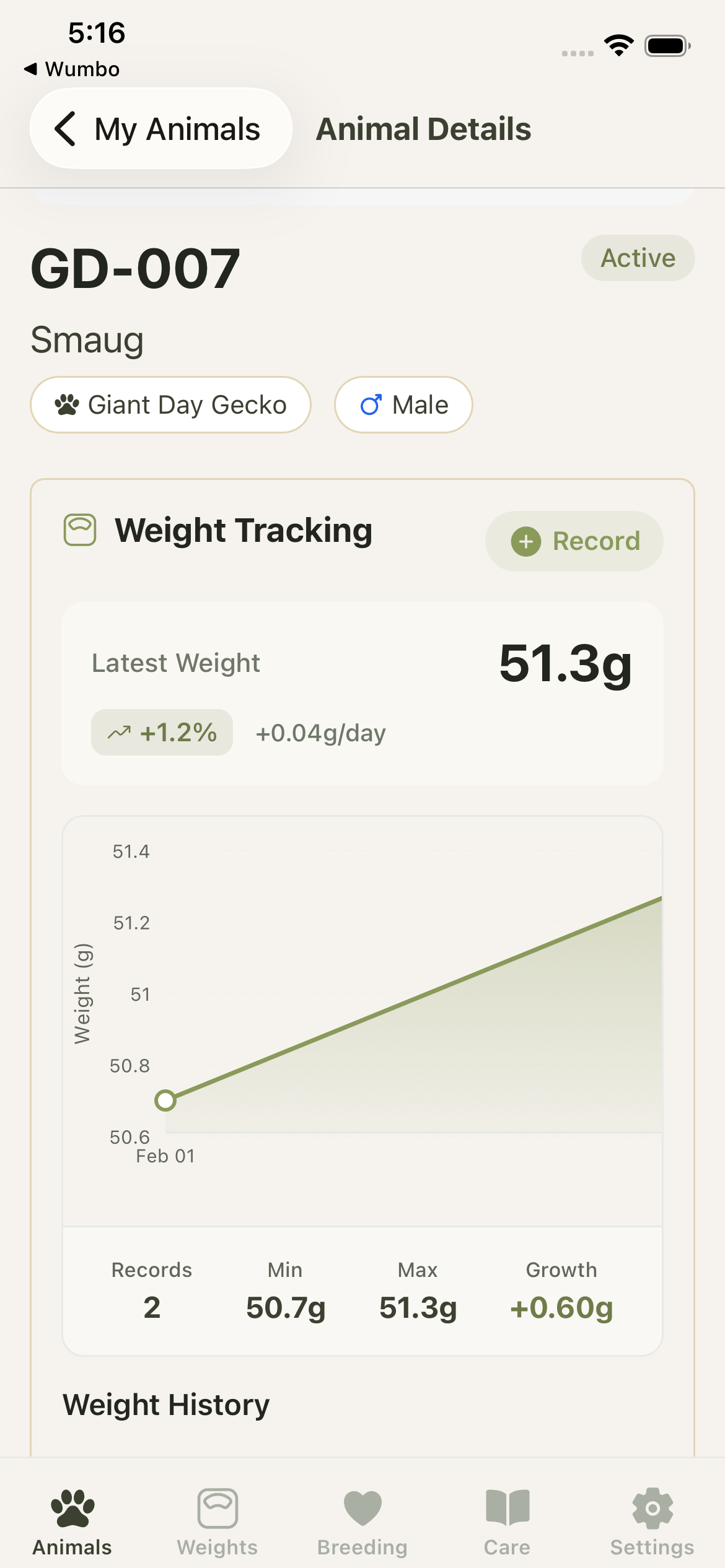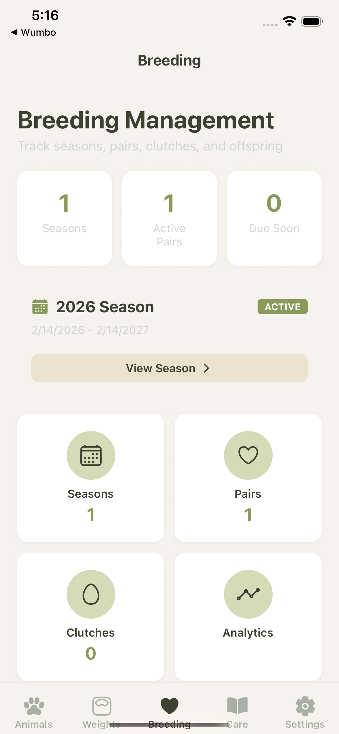 Track your collection, manage breeding seasons, visualize lineage, monitor weight trends, and collaborate with your team. Built for keepers who take their husbandry seriously, with simple pricing that grows with you.