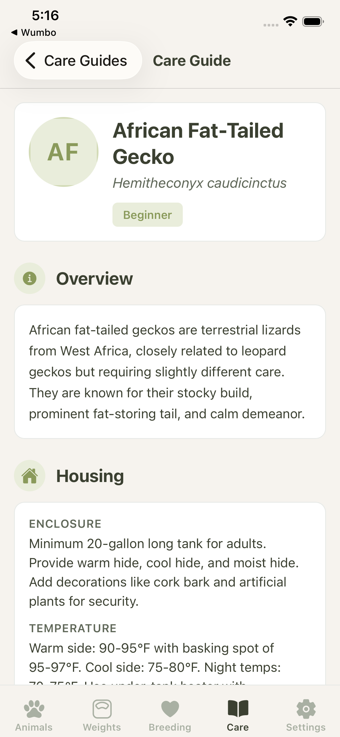 ReptiDex includes dedicated care guides and species-specific features for 20+ popular reptile species.
